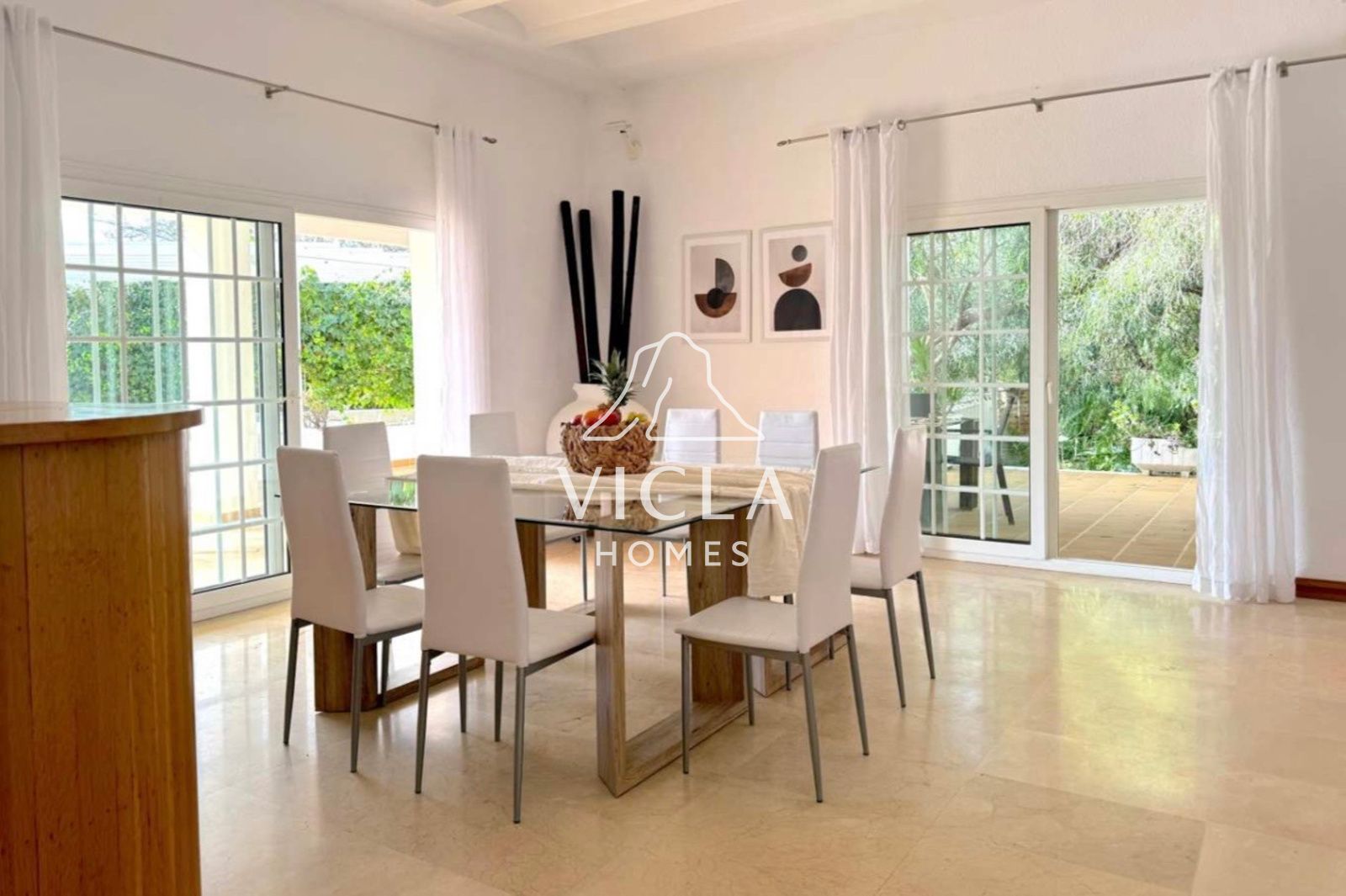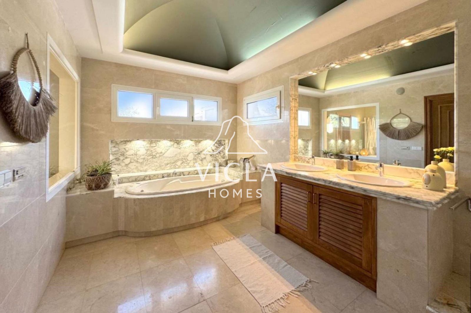 La casa se caracteriza por su arquitectura luminosa, con techos altos, grandes ventanales que conectan el interior con el exterior y suelos de mármol con calefacción radiante que aportan confort durante todo el año.